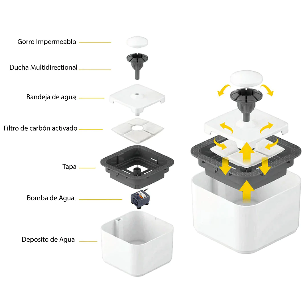 - Flujo de agua: el agua fluye circularmente, más interesante para su mascota que el agua que cae en un tazón de agua ordinario, atrayendo a beber más.