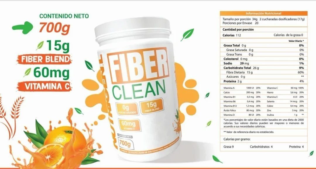 NUTRIGEN. L FIBER CLEAN: producto a base de maltodextrina rico en fibra, contiene la fabulosa FIBER BLEND, que es una mezcla de las mejores fibras como lo son (Polidextrosa, Psyllium, Inulina, Fiber Gum, Fibra de Manzana y Linaza), además de contener alto porcentaje en vitaminas y minerales en donde se aporta el 100% de vitamina C para mejorar nuestro sistema tanto digestivo como inmunológico. FIBER CLEAN es endulzado con stevia.